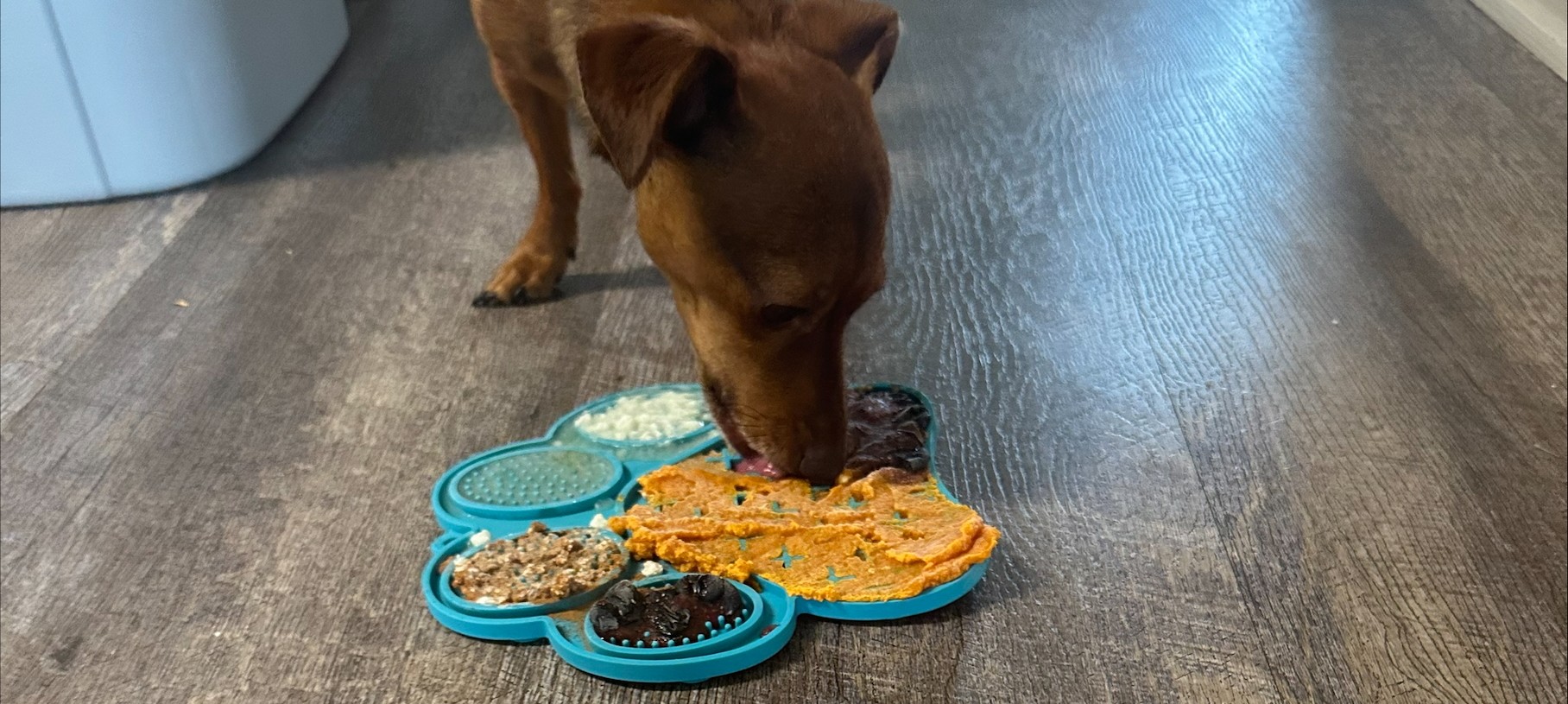 Why is it so important to provide your dog with enrichment? Well, the same way humans feel the need to go for a run, enjoy playing a game or doing a puzzle, and put on a fun show to watch, dogs also need exercise and mental stimulation. An activity and treat like a lick mat can alleviate the boredom that might be causing chewing on furniture or other forbidden items and excessive barking. And the same way parents may slip vegetables into their children’s meals, you as dog parents can add a mixture of highly nutritious foods to help your dog get the most out of their treat.